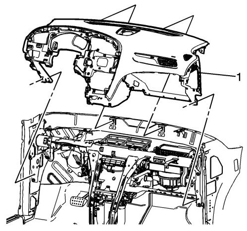 1. With the aid of an assistant, align the instrument panel assembly (1) to the vehicle.