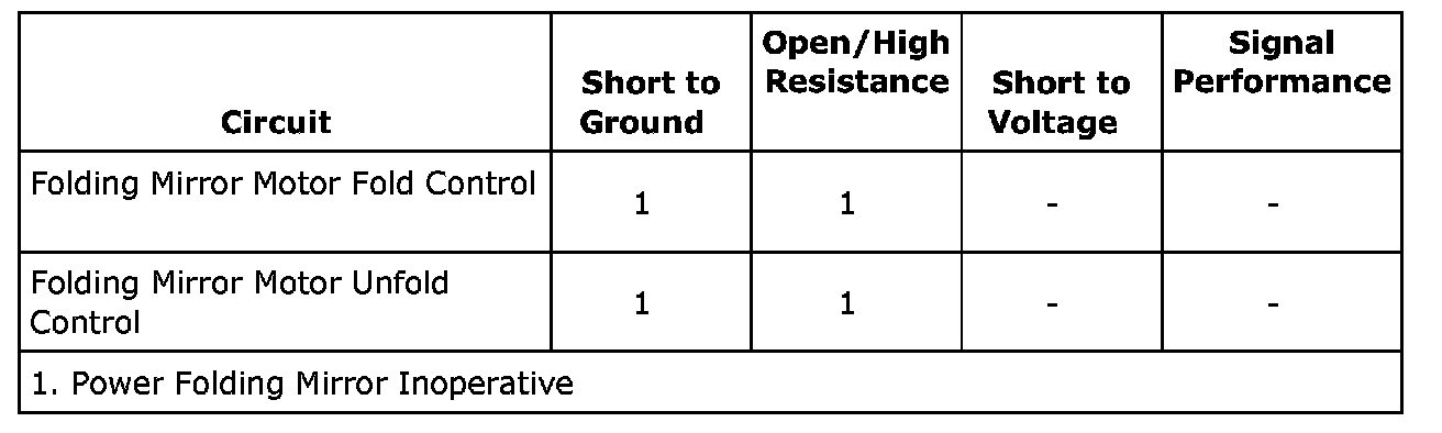 The outside mirror switch controls the power fold/unfold functions of the outside rearview mirrors. The folding mirror motors are controlled by using bi-directional motor controls through the folding mirror motor fold control circuit and the folding mirror motor unfold control circuit.