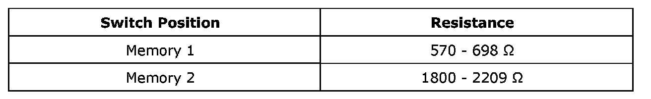 4. Test the resistance between terminal 1 and terminal 6 while pressing the memory 1 and memory 2 buttons. Compare the resistance readings to the values in the Memory Switch Values table below.