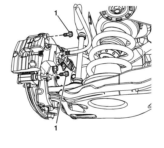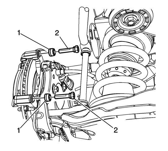 Using a backup wrench to hold the brake caliper guide pin stationary, install the brake caliper guide pin bolts (1) and tighten to 60 Nm (44 lb ft).