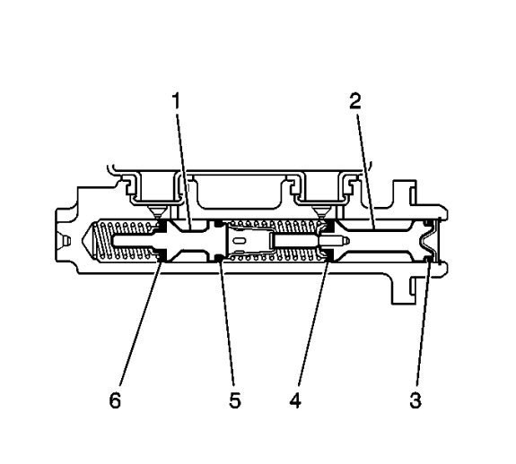 8. If the brake pedal apply did not feel spongy, and the brake pedal travel was initially steady and not excessive, but then gradually fell, then the master cylinder requires overhaul or replacement due to an internal leak past the secondary piston (1) from the secondary piston primary seal (6) or secondary seal (5).