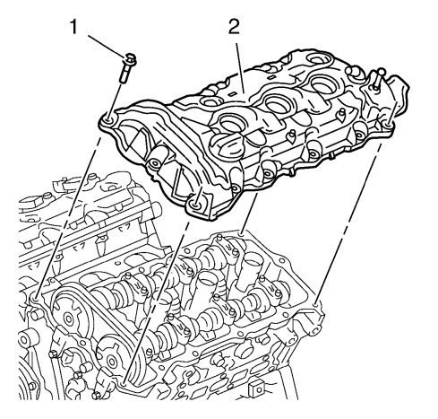 6. Loosely install the 13 camshaft cover bolts bank 2 (1).