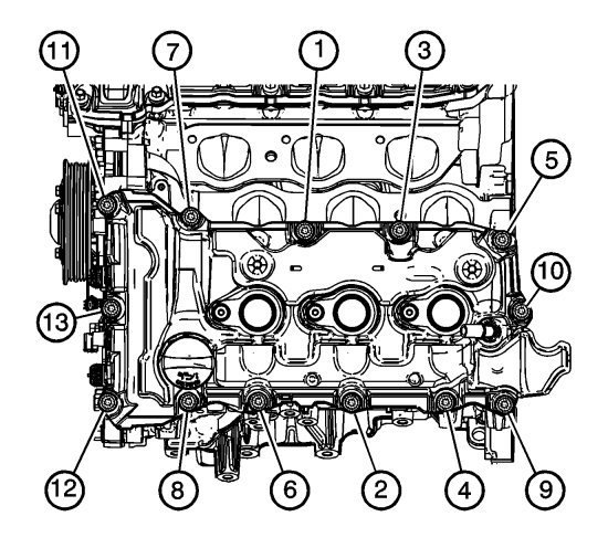 Tighten the 13 camshaft cover bolts bank 2 in the sequence shown (1-13):
