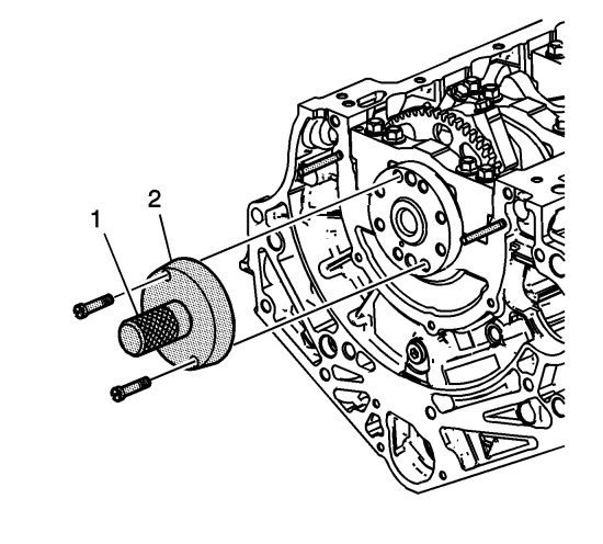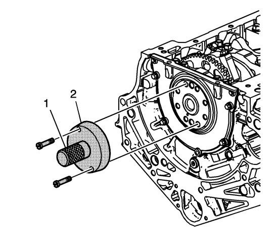 2. Install the EN-47839 tool with the EN-42183 handle (1, 2) onto the rear of the crankshaft flange.