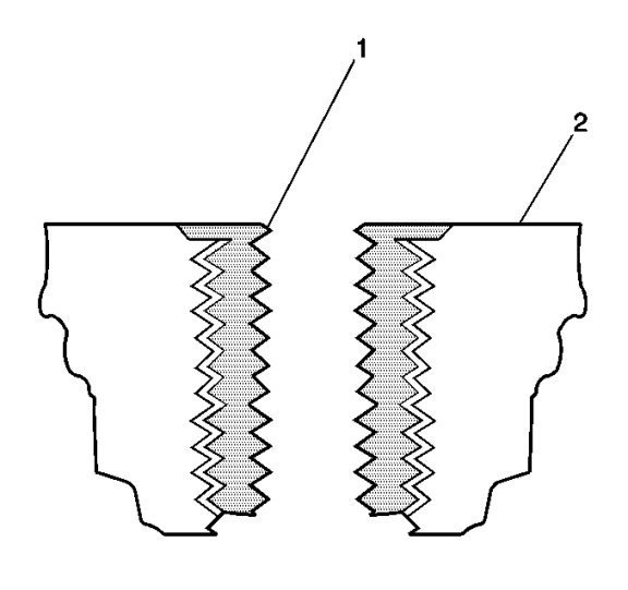 6. Apply threadlock sealant, EN 42385-109, LOCTITE 277(R) or equivalent (1) to the insert OD threads (2). Refer to Adhesives, Fluids, Lubricants, and Sealers for recommended sealant.