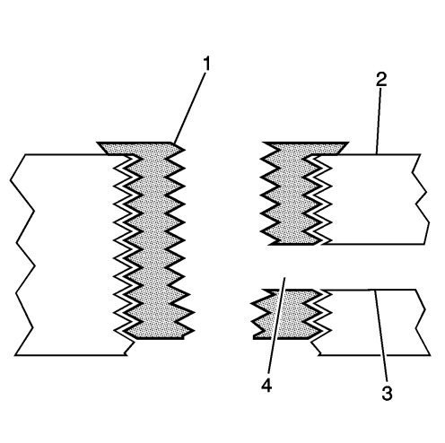 17. Apply threadlock sealant, EN 42385-109, LOCTITE 277(R); or equivalent (1) to the insert OD threads (2). Refer to Adhesives, Fluids, Lubricants, and Sealers for recommended sealant.