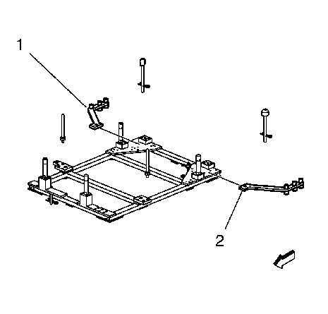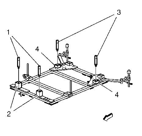 Raise the hydraulic lift with CH-49289 centering adapter (2) to support the front suspension frame (1).