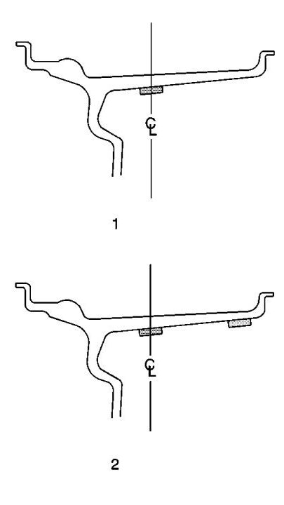 - When static balancing, locate the wheel balance weights along the wheel centerline (1) on the inner wheel surface if only 28 g (1 oz) or less is called for. If more than 28 g (1 oz) is called for, split the weights as equally as possible between the wheel centerline and the inboard edge of the inner wheel surface (2).