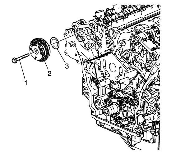 Ensure the proper camshaft thrust washer is used, if applicable. Use a 1.6 mm (0.063 in) thrust washer on applications that have 5 attaching screws on the back side of the camshaft position actuator without an identification dot (1). Use a 1.1 mm (0.043 in) thick thrust washer with yellow speckles on applications that have 4 attaching screws on the back side of the camshaft position actuator (2) and on applications that have 5 attaching screws on the back side of the camshaft position actuator with an identification dot (3).