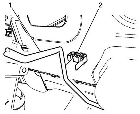 4. Disengage the evaporative emission line (1) from the plastic retainers (2) and remove the evaporative emission line.