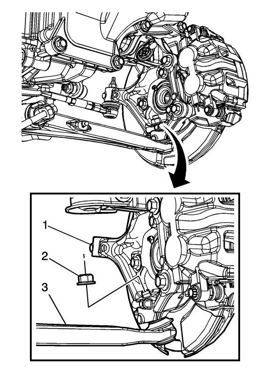 3. Install the front lower control arm rear bolts (2) and the front lower control arm rear nuts (1).