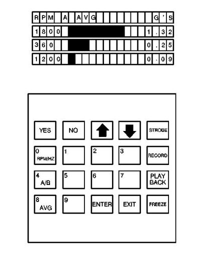 The frequency readings are displayed along the left side of the screen, followed to the right by either a bar graph or the suspected source of the vibration - depending upon the mode selected. The amplitude reading for each frequency along the right side of the screen. The top row of the screen indicates the units of measure being displayed for the frequencies along the left side and for the amplitudes along the right side. The top row also indicates the vibration sensor input port which was selected on the keypad (A or B) and which mode was selected: averaging or nonaveraging (instantaneous).