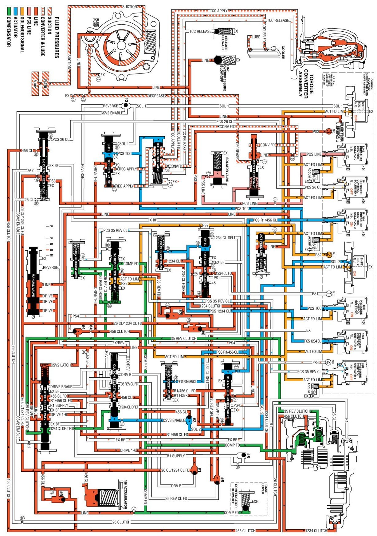 PCS R1/456 clutch fluid moves the R1/456 clutch regulator valve against R1/456 clutch regulator valve spring force to allow line fluid to pass through the valve an enter the R1/456 clutch feed circuit. R1/456 clutch feed is then routed to the 4-5-6 clutch boost valve and clutch select valve 2.