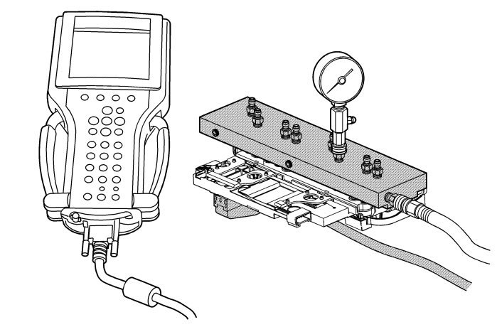 The purpose of this procedure is to test the functionality of the control solenoid (w/body and TCM) valve assembly solenoids for a gross stuck open or stuck closed condition. The DT-47825-100 test block is bolted to the control solenoid (w/body and TCM) valve assembly on the valve body mounting surface. Pressurized air is passed into the aluminum test block, through the control solenoid (w/body and TCM) valve assembly solenoid passage and back to a pressure gauge on the test block. The pressure gauge indicates open if air pressure is passed through the solenoid, or closed if the solenoid is unable to pass air through. A diagnostic tool is used to control the solenoid valves ON and OFF. The valve function can be decided when looking at the pressure gauge. The recommended shop air pressure for this test is 90-100 psi.