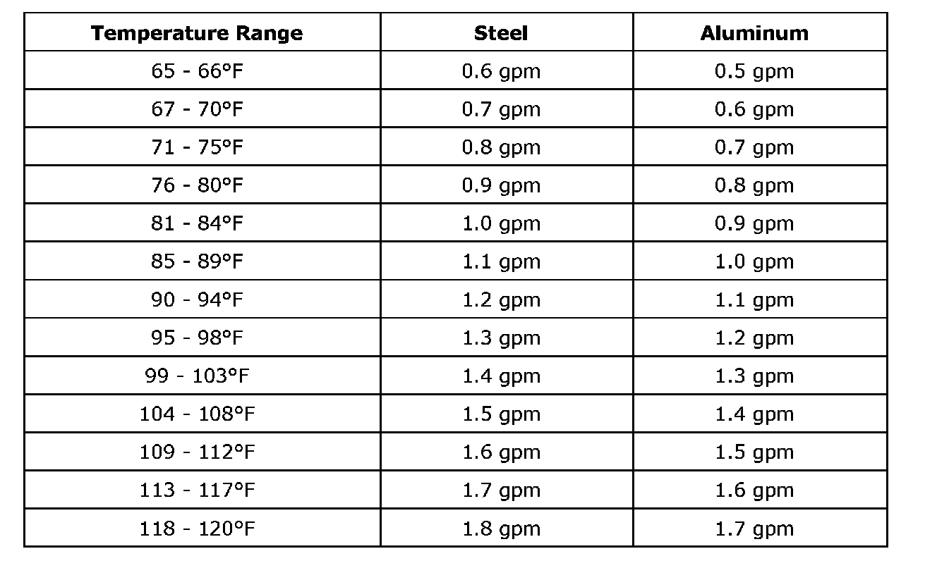3. Refer to the table below. Using the temperature from step 1, locate on either the Steel MINIMUM Flow Rate table or the Aluminum MINIMUM Flow Rate table the minimum flow rate in gallons per minutes (GPM). Record the minimum flow rate in GPMs and the supply fluid temperature for further reference.