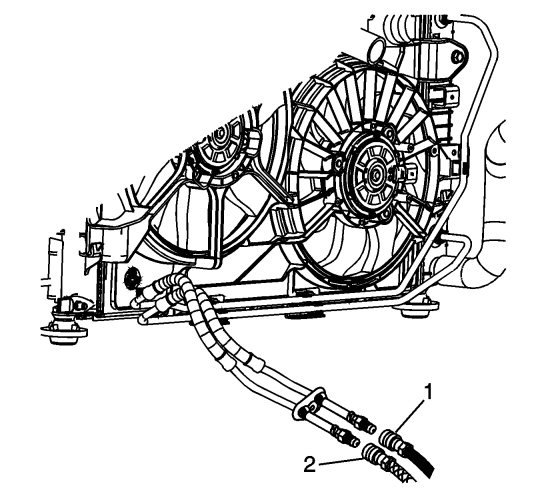 2. Connect the black supply hose (1) to the adapter connected to the return line, bottom hose of the transmission oil cooler.