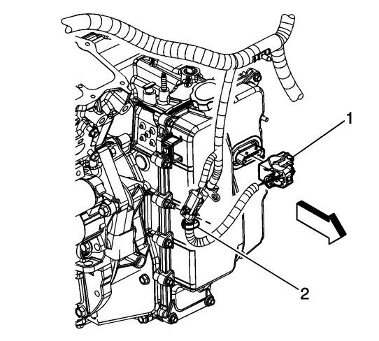 12. Install the wire harness retainer (2) to the control valve body cover stud.