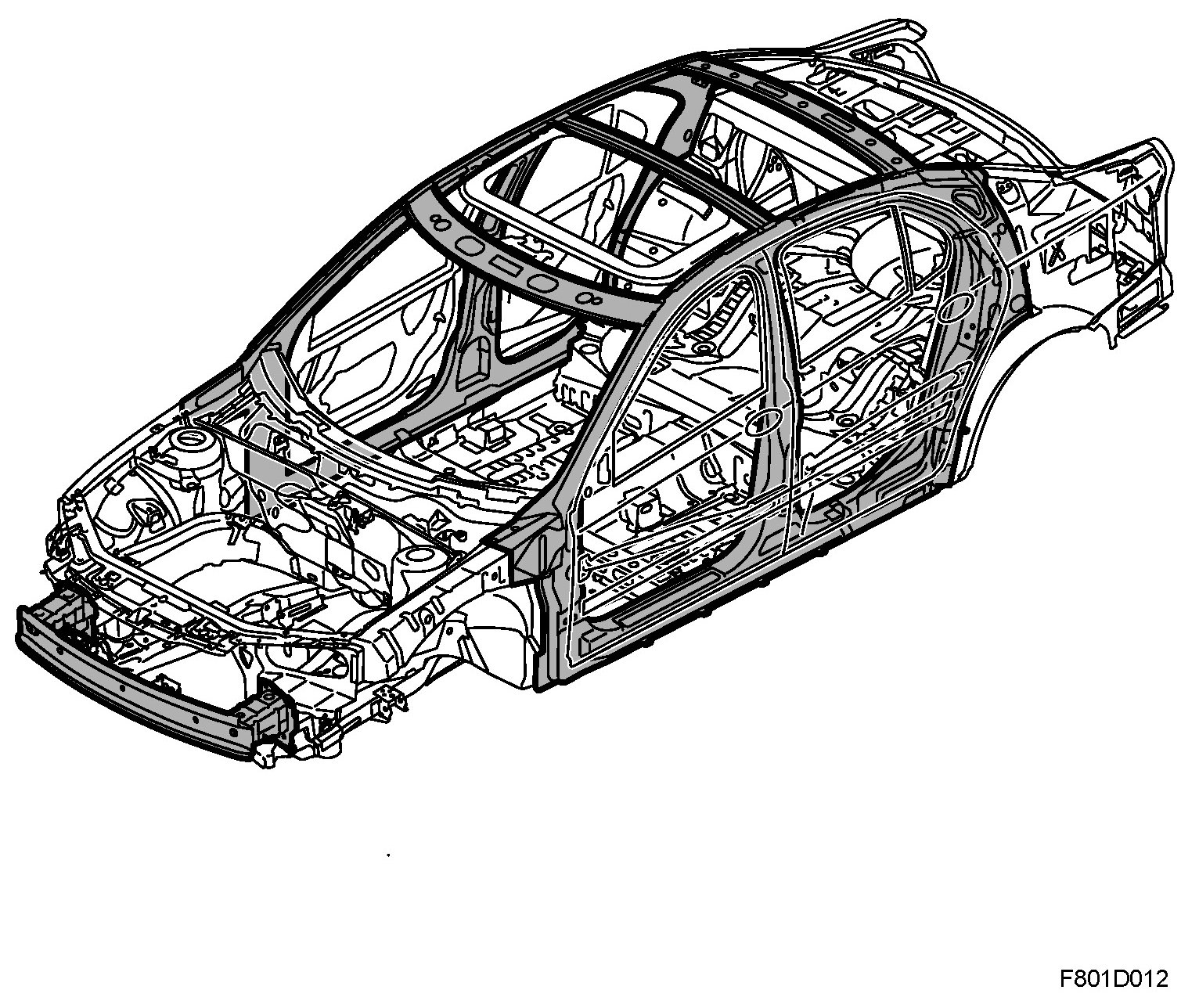 In addition to the reinforcements high strength steel (HSS) is used in order to make the cabin frame as structurally stable as possible. The illustration shows which parts of the body structure in the Saab 9-3 Sport Saloon are made from HSS.