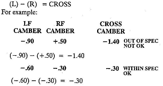 Cross camber and cross caster specifications refer to the difference between the left and right side angles. Cross camber and cross caster can influence vehicle steering pull tendencies. Usually, alignment results will be best when these measurements are as close to zero as possible.
