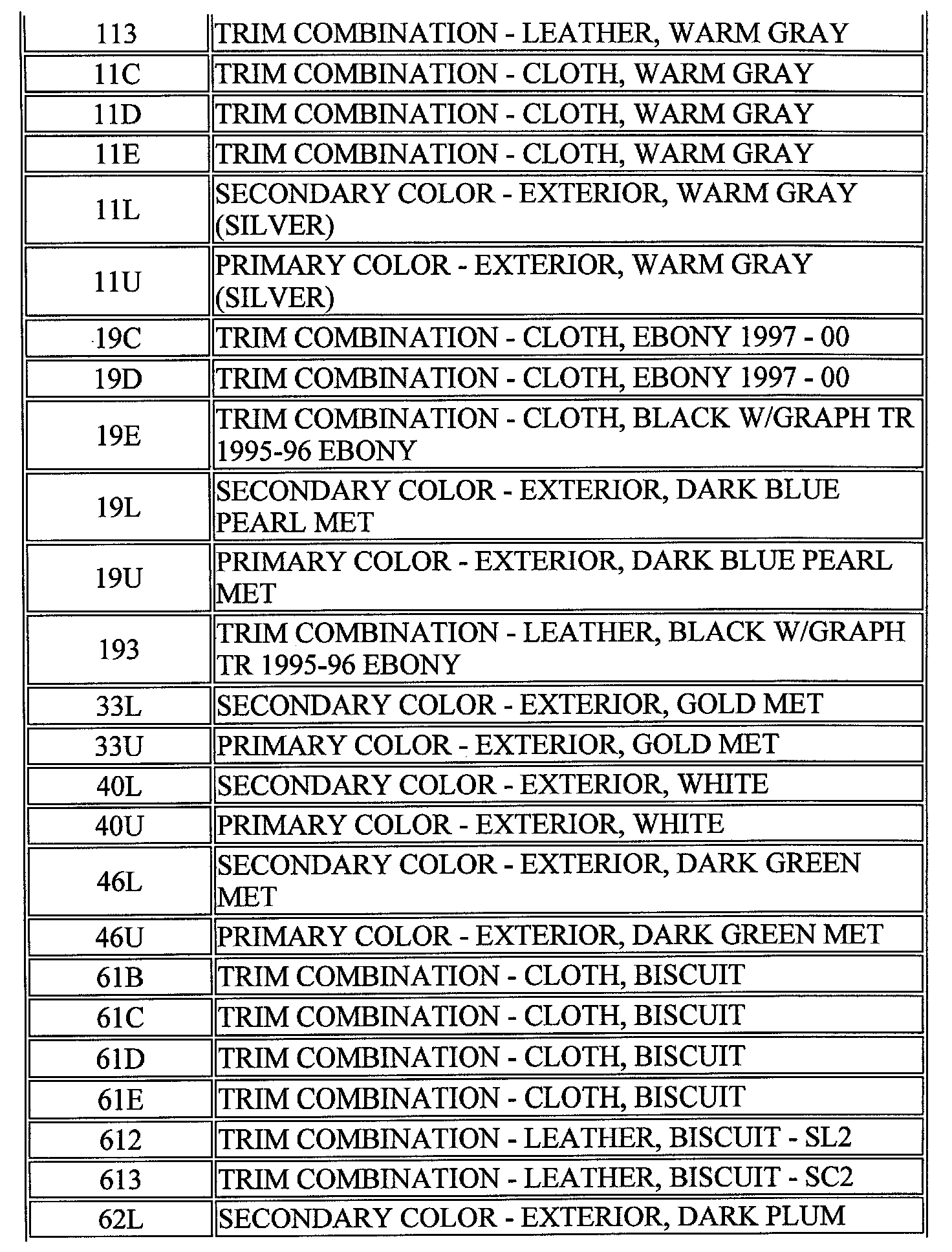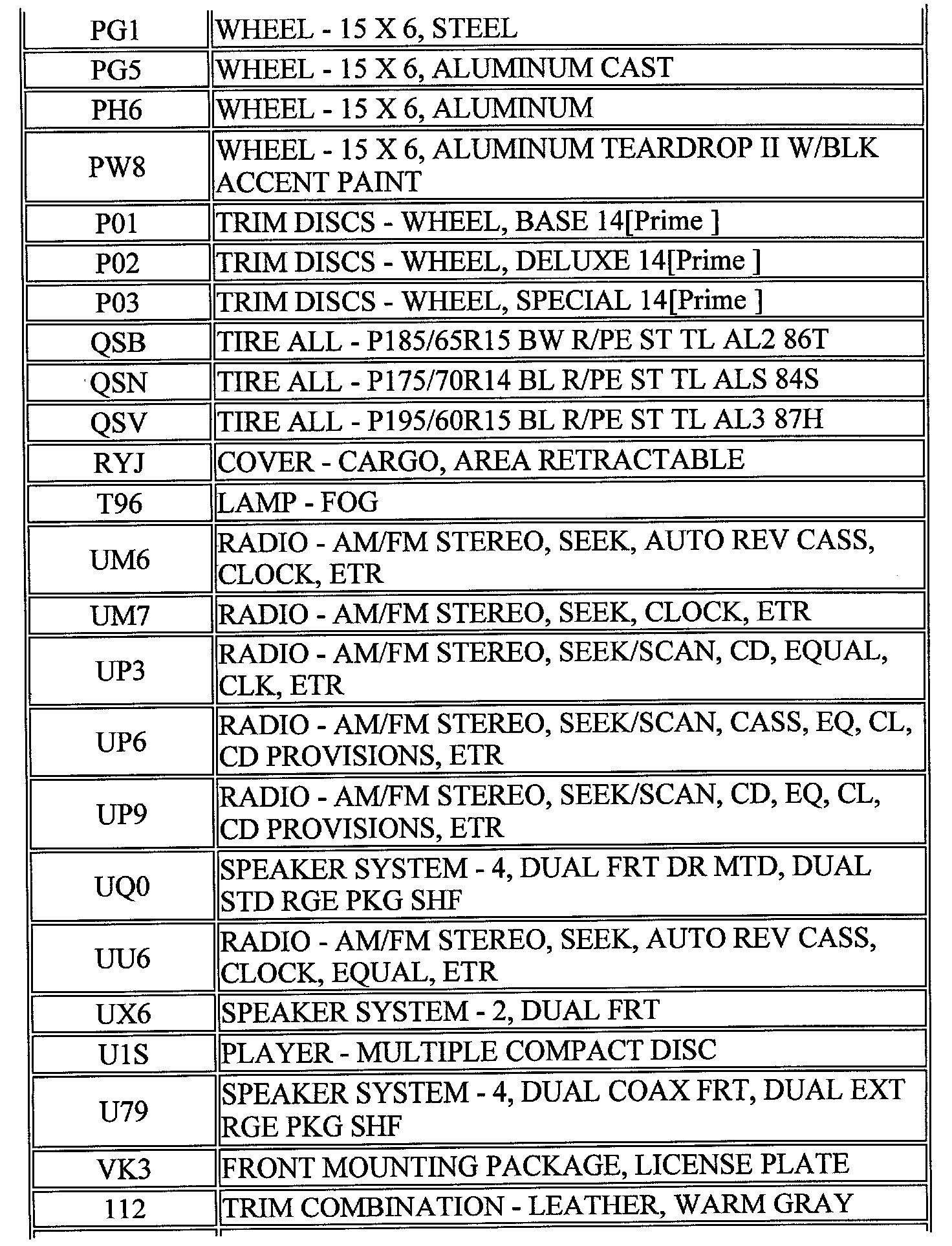 RPO Code List