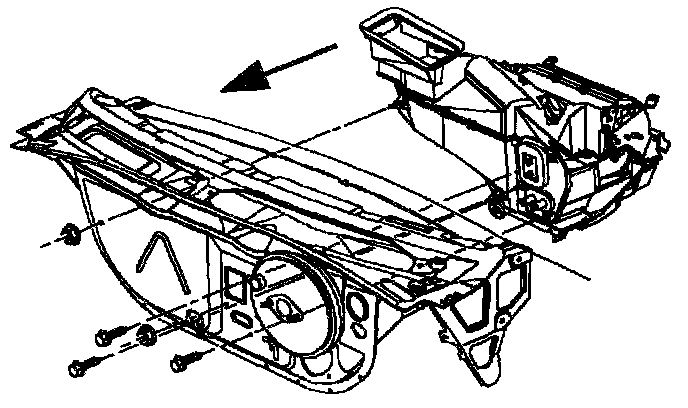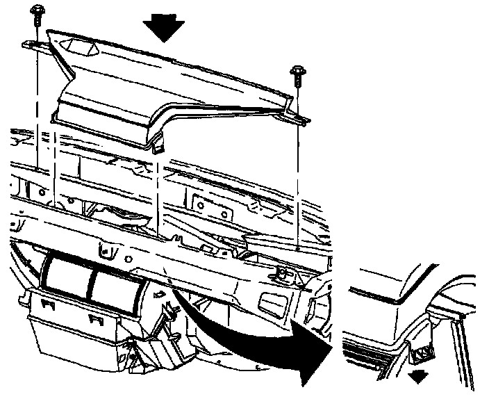 8. Rotate windshield defroster nozzle onto mode valve assembly and install screws. Make sure duct is snapped on both sides of HVAC module.