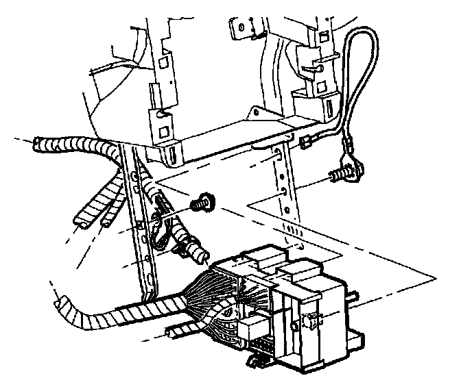 16. Install radio ground strap and screw through H-brace to junction block.