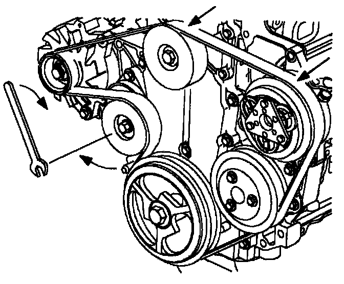 1. Depress tensioner arm using a 14 mm or 9/16 inch wrench or Snap-on tool S8190A (or equivalent).