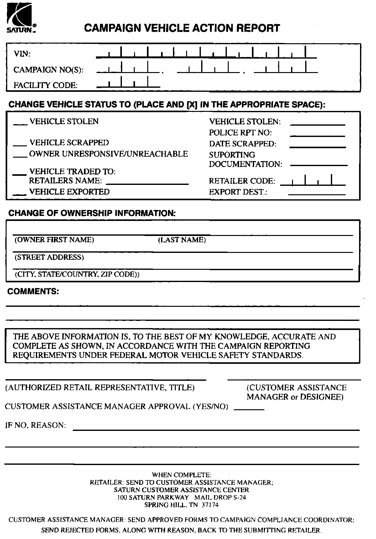 * Submit a Campaign Vehicle Action Report to your Customer Assistance Manager (CAM) at the Saturn Customer Assistance Center.