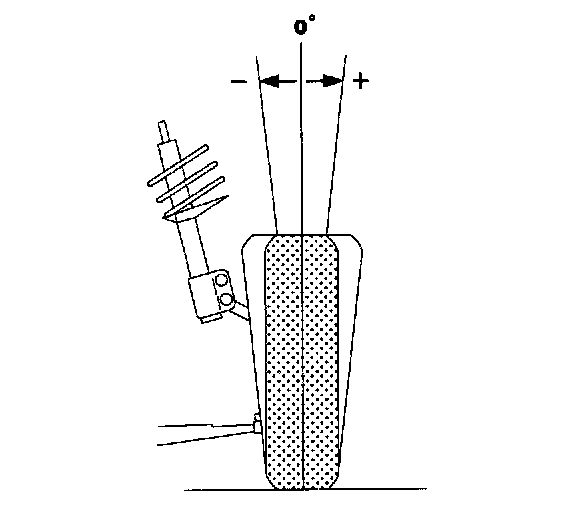 Caster is a measure of the angle between the steering axis and vertical when viewed from the side of the vehicle with the wheel in the straight ahead position. The steering axis is determined by the location of the lower control arm ball joint and the center of the strut-to-body attachment. A line drawn through the center of the ball joint and the strut-to-body joint represents the steering axis. When the center point of the strut-to-body attachment is rearward of the ball joint, the caster is positive. When the center of the strut-to-body attachment is forward of the ball joint, the caster is negative.