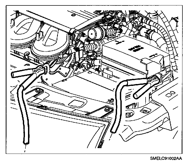 6. Attach one end of the remaining cable to the negative terminal of the booster battery, and the other end to the engine lift hook.