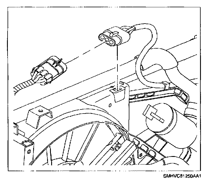 4. Remove pusher fan harness from puller fan shroud tabs and push harness clear of radiator end tank.
