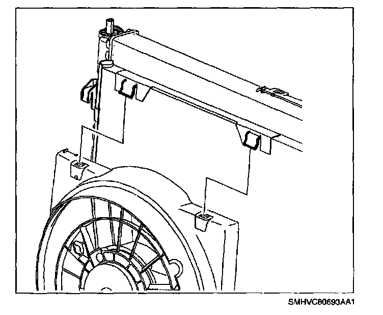 NOTE: Condenser block must be engaged to radiator end tank bracket before sliding condenser upward.