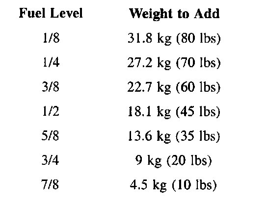 3. If vehicle fuel tank is not full, the following chart may be used to determine amount of weight necessary to be added to the trunk of vehicle to simulate a full fuel tank.