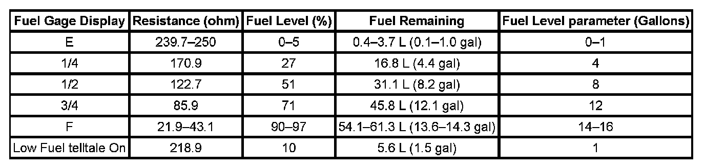 The values in the table are approximate values based on information obtained from properly operating vehicles. Actual results may vary slightly.