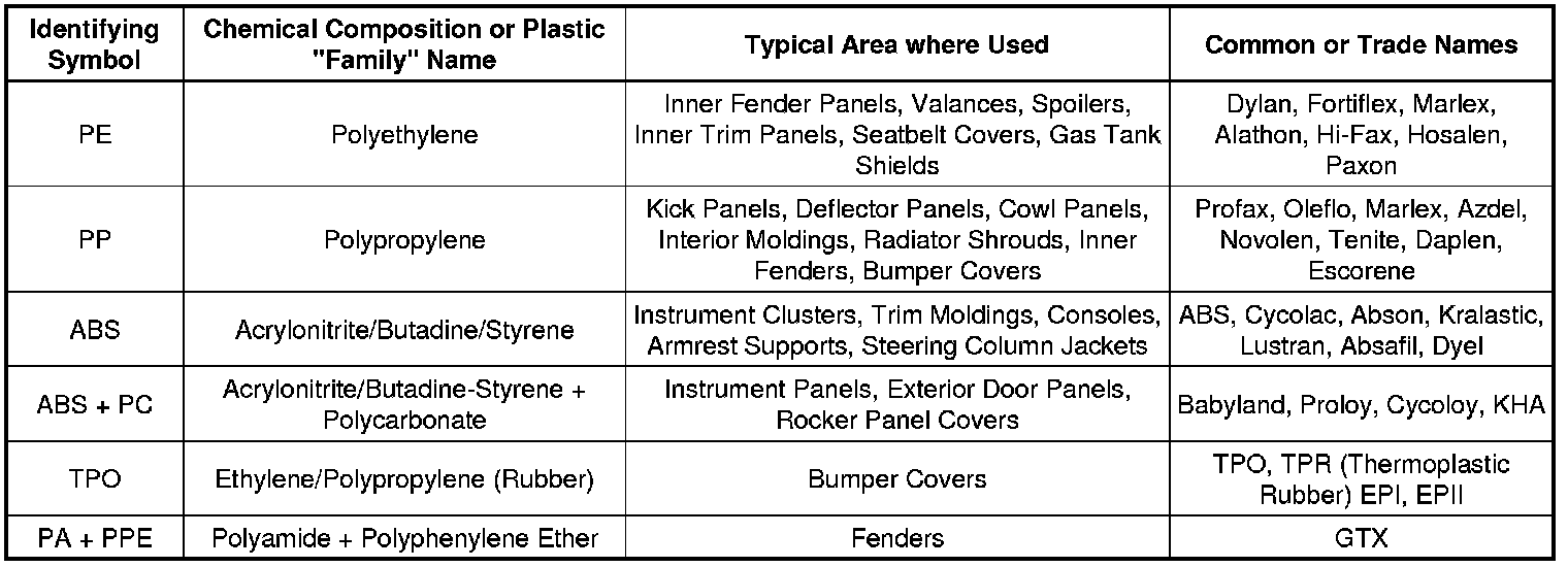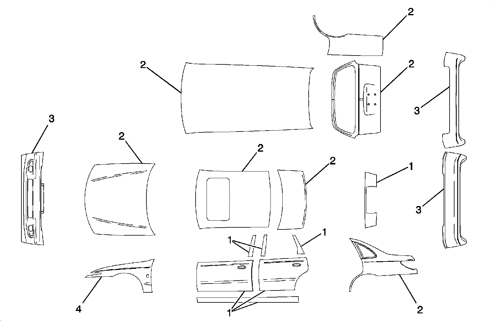 Exterior body panels are constructed of various materials. This is due to increased dent and corrosion resistance of modern composites. All vertical panels: fenders, doors, quarter and rocker panels are made from rigid thermoplastic. Front and rear fascias, bumper covers, are constructed of thermoplastic olefin (TPO) (3). Hood, roof, and deck are steel (4).