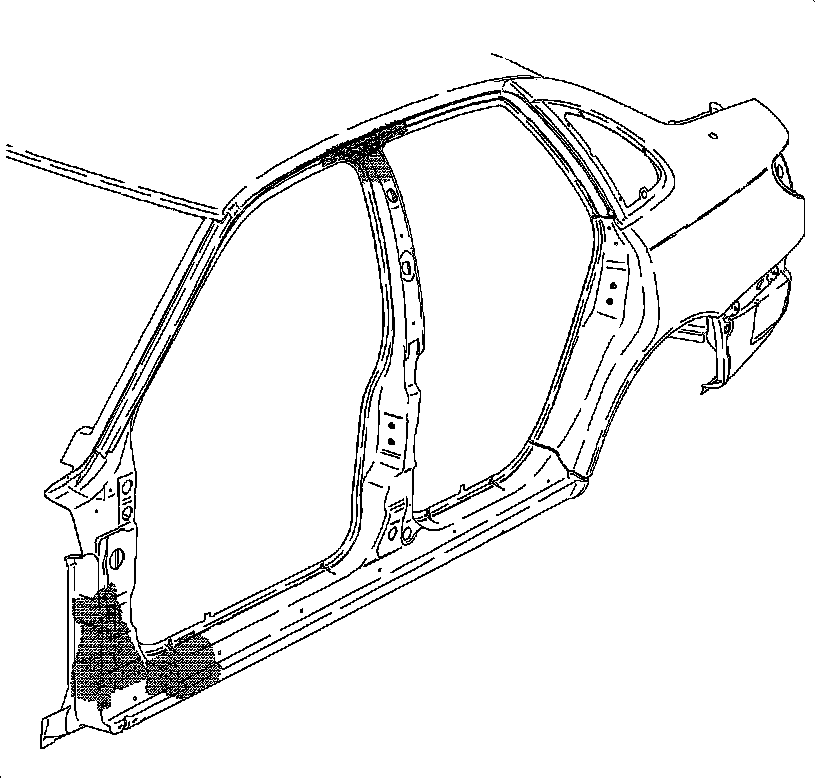 Important: L Series vehicles are equipped with structural reinforcement inserts located in the Front Body Hinge Pillar/Rocker area, and Upper Center Pillar Roof area as shown in the illustration above. The purpose of the structural reinforcement inserts is to help distribute energy created from a collision through the entire vehicle. The front body hinge pillar/rocker area structural reinforcement inserts must be replaced when the front body hinge pillar is replaced. If the upper center pillar to roof area has visual damage above the section joint as defined in the center pillar panel - section removal and replacement procedure in this section, the structural reinforcement insert must be replaced. Failure to replace any structural reinforcement inserts as described above will compromise the structural integrity of the vehicle.