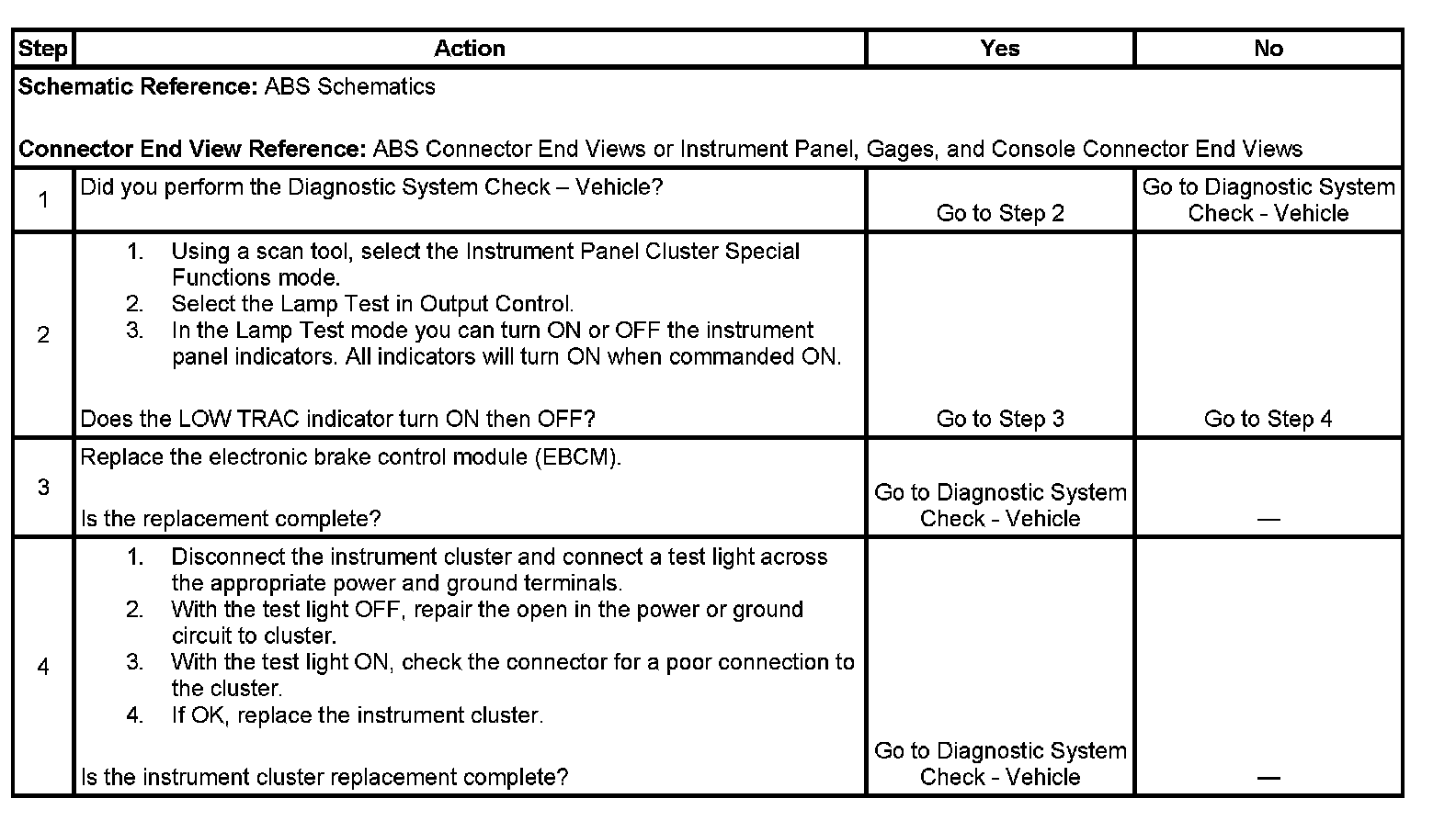 The instrument panel cluster (IPC) turns the LOW TRAC indicator ON during the IPC bulb check for approximately 3 seconds when the ignition switch is turned to the ON position. If the electronic brake control module (EBCM) sets a DTC, the EBCM sends the IPC the command to turn the LOW TRAC indicator ON.