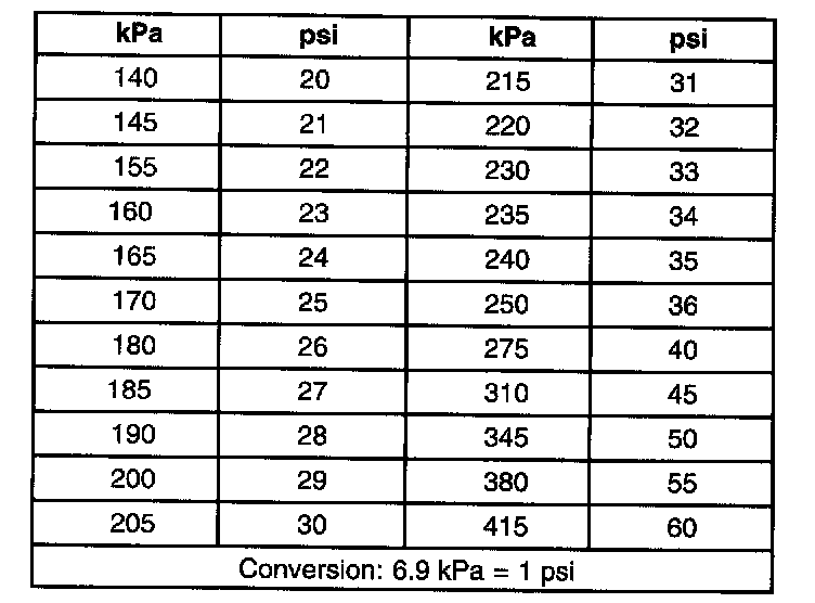 Inflation Pressure Conversion (Kilopascals to lbs.)