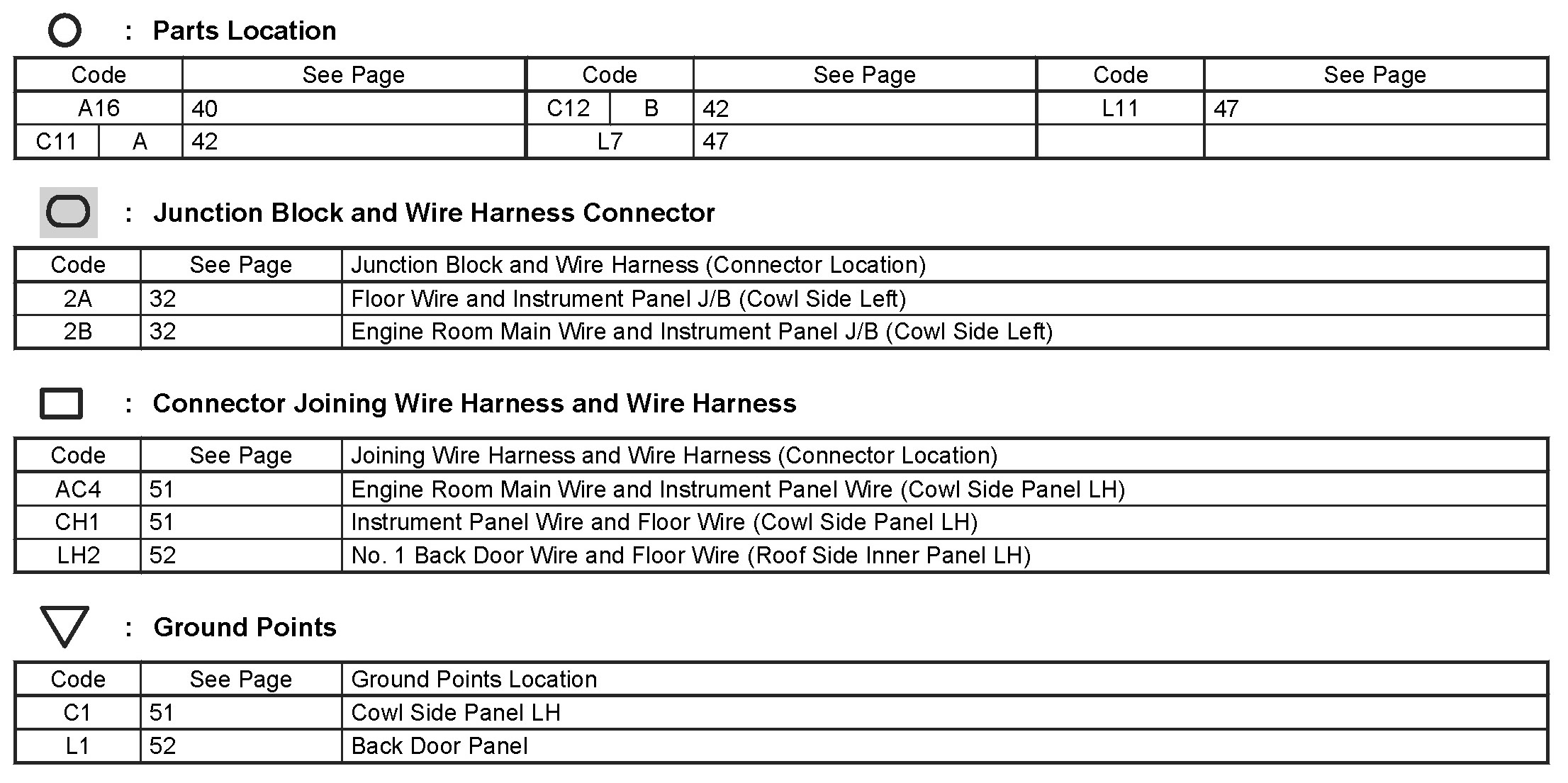 Locations: The locations of components, connectors, ground points, and splices referred to within these diagrams can be found at Vehicle Locations. Locations