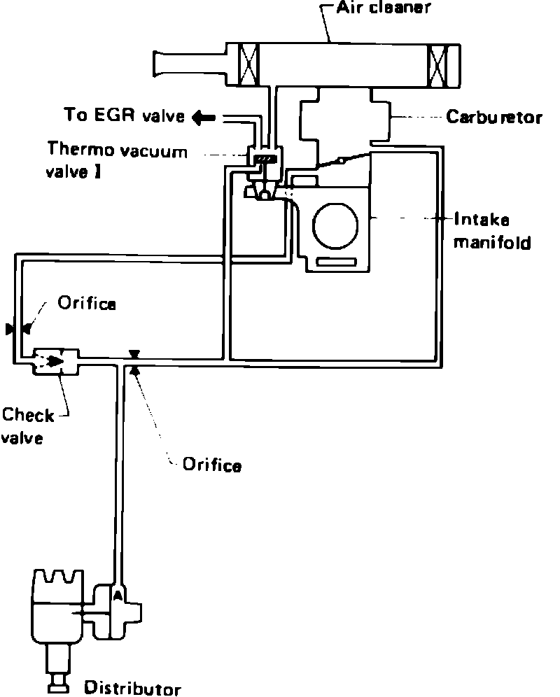 The ignition control system, Fig. 16, reduces HC, CO, and NOx emission during all operating conditions. Actual ignition timing is controlled by the combination of a centrifugal advancer and a vacuum controller on the distributor.