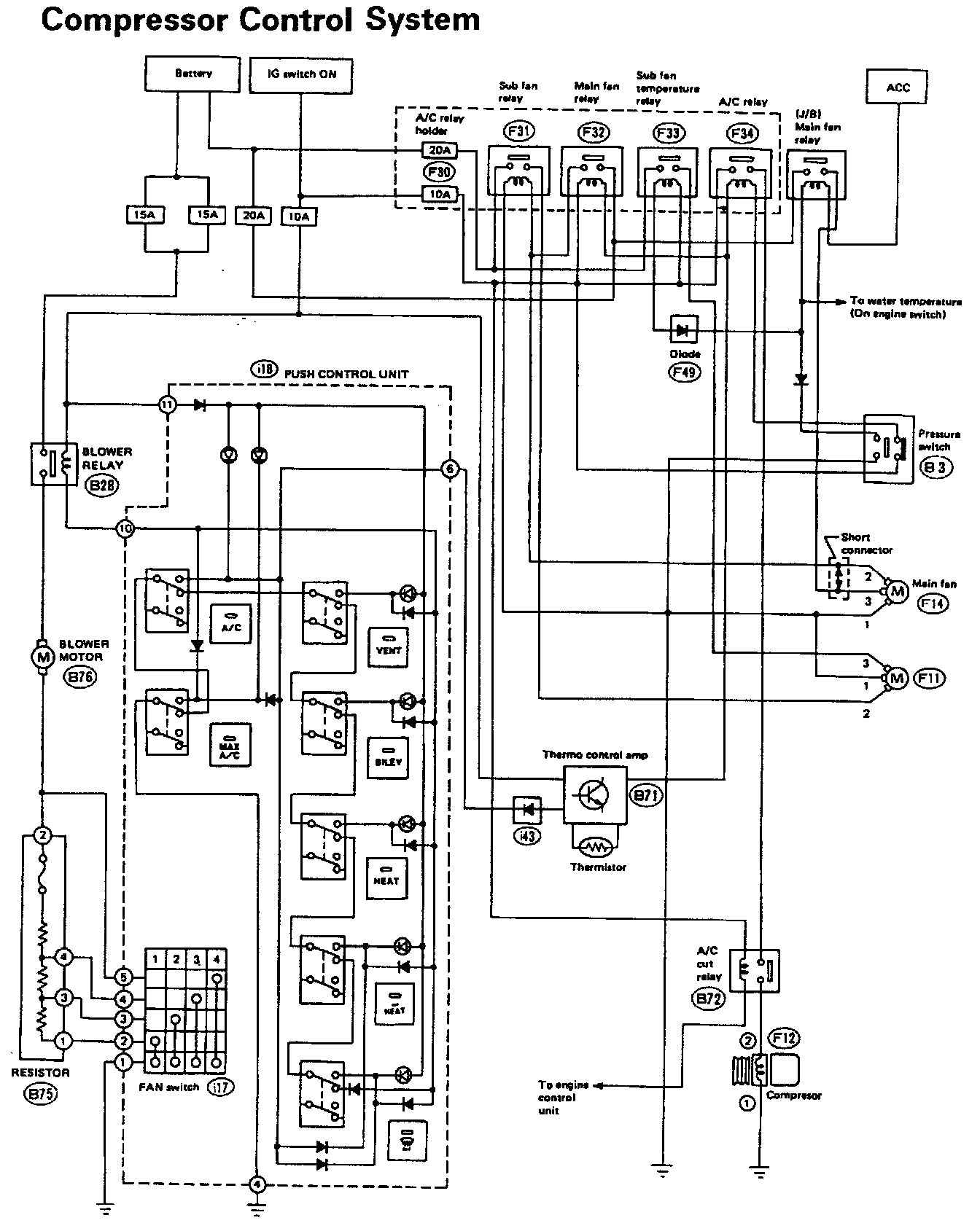 1) When the A/C switch and fan switch are turned ON, the A/C relay activates. The compressor and F.I.C.D. are turned on, and then the main and sub fans also operate. Blower relay operates to direct the airflow rate determined by FAN switch position.