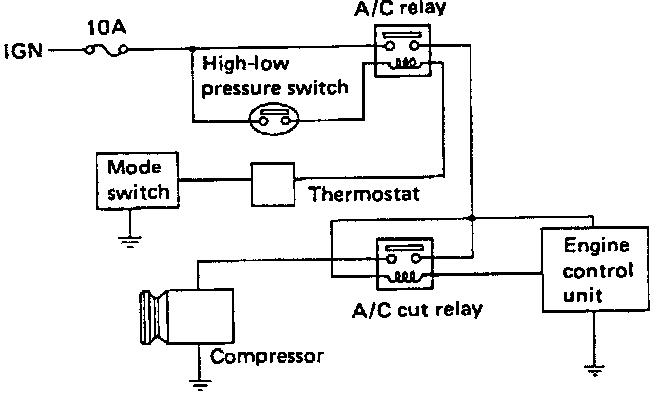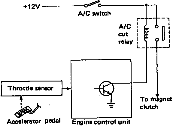 The A/C switch turns the A/C system on or off. The on-off operation of the switch is transmitted to the ECU. The A/C cut relay breaks the current flow to the compressor, through the use of an output signal from the ECU, for a certain period of time when a "full-throttle" signal (emitted from the throttle sensor) enters the ECU while the compressor is operating. This prevents the degradation of acceleration performance and stabilizes the main fuse box located on the left side of the engine compartment.