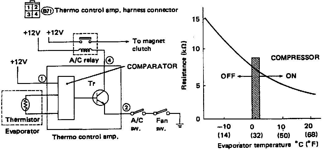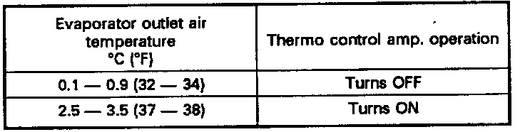 The thermo control amplifier disconnects the magnet clutch circuit to prevent the evaporator from becoming frosted when the temperature of the evaporator fin drops close to 0°C (32°F). As the evaporator is cooled, the thermistor (located on the evaporator fin) interrupts the "base" current of the amplifier. This in turn de-energizes the A/C relay coil, which in turn disconnects the magnet clutch circuit.