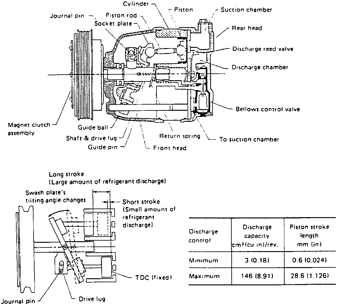 However, a variable displacement compressor continually senses the pressure on the low pressure side and the amount of refrigerant so as to prevent the pressure from dropping too low. The variable compressor is basically a swash plate type that changes piston stroke in response to the required cooling capacity. The tilt of the swash plate allows the piston's stroke to change so that refrigerant discharge can be continuously changed between 3 cm3 (0.18 cu in) and 146 cm3 (8.91 cu in).