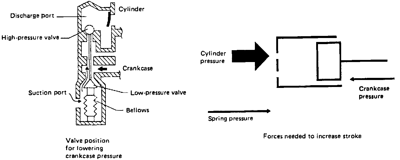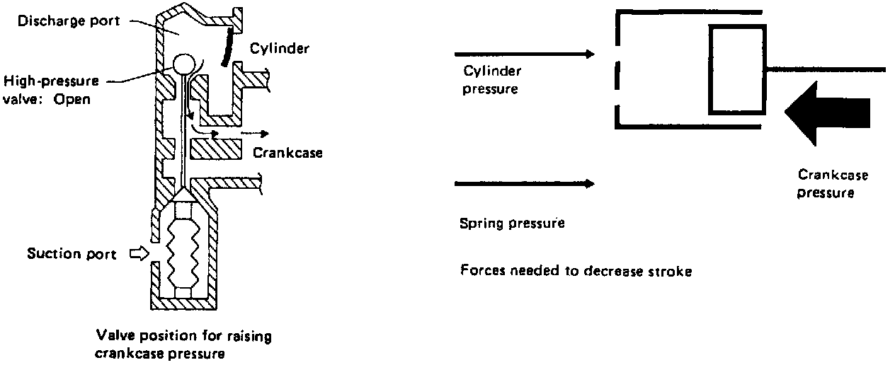 Refrigerant pressure on the low-pressure side increases with an increase in heat loads. When this occurs, the control valve's bellow compress to open the low-pressure side valve and close the high-pressure side valve. This causes the crankcase's internal pressure to equal the pressure on the low-pressure side and the cylinder's internal pressure to be greater than the crankcase's internal pressure. Under this condition, the swash plate is set to the maximum stroke position.