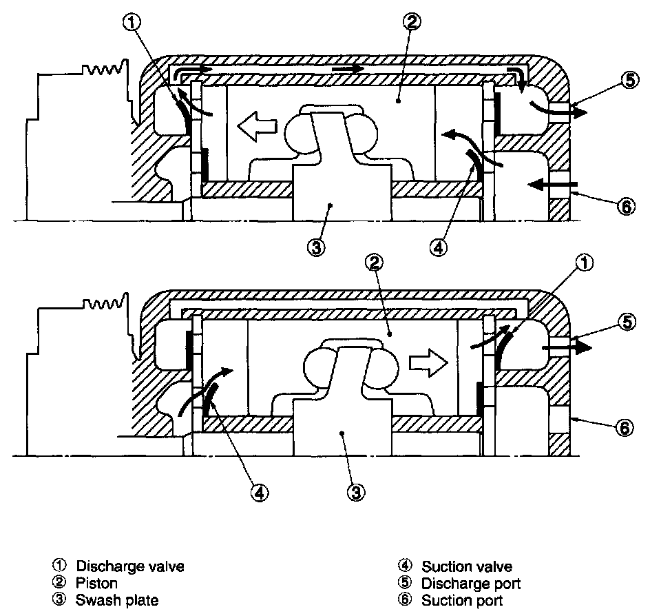 The low pressure refrigerant gas from the evaporator is forced from the suction side of each cylinder head through the suction valve opened by the suction action of the piston into the cylinder. When the refrigerant in the cylinder is compressed by the piston and increases its pressure, the discharge valve is caused to open to discharge the refrigerant to the discharge side.