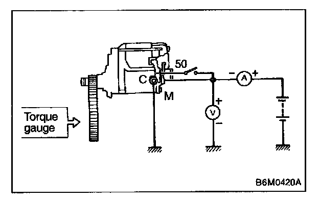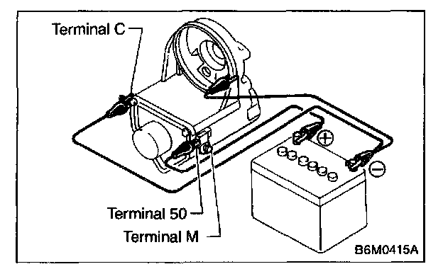 Connect two battery negative leads onto terminal 50 and onto switch body respectively. Then connect battery positive lead onto terminal C. Next, disconnect lead from terminal 50. Pinion should return immediately.