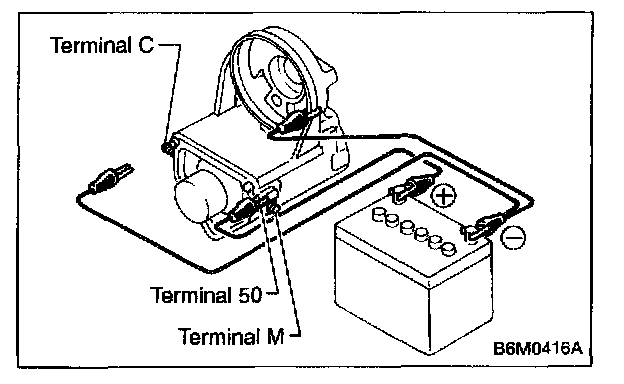 Connect two battery negative leads onto magnetic switch body and terminal C respectively. Then connect battery positive lead onto terminal 50. Pinion should extend when lead connections are made.