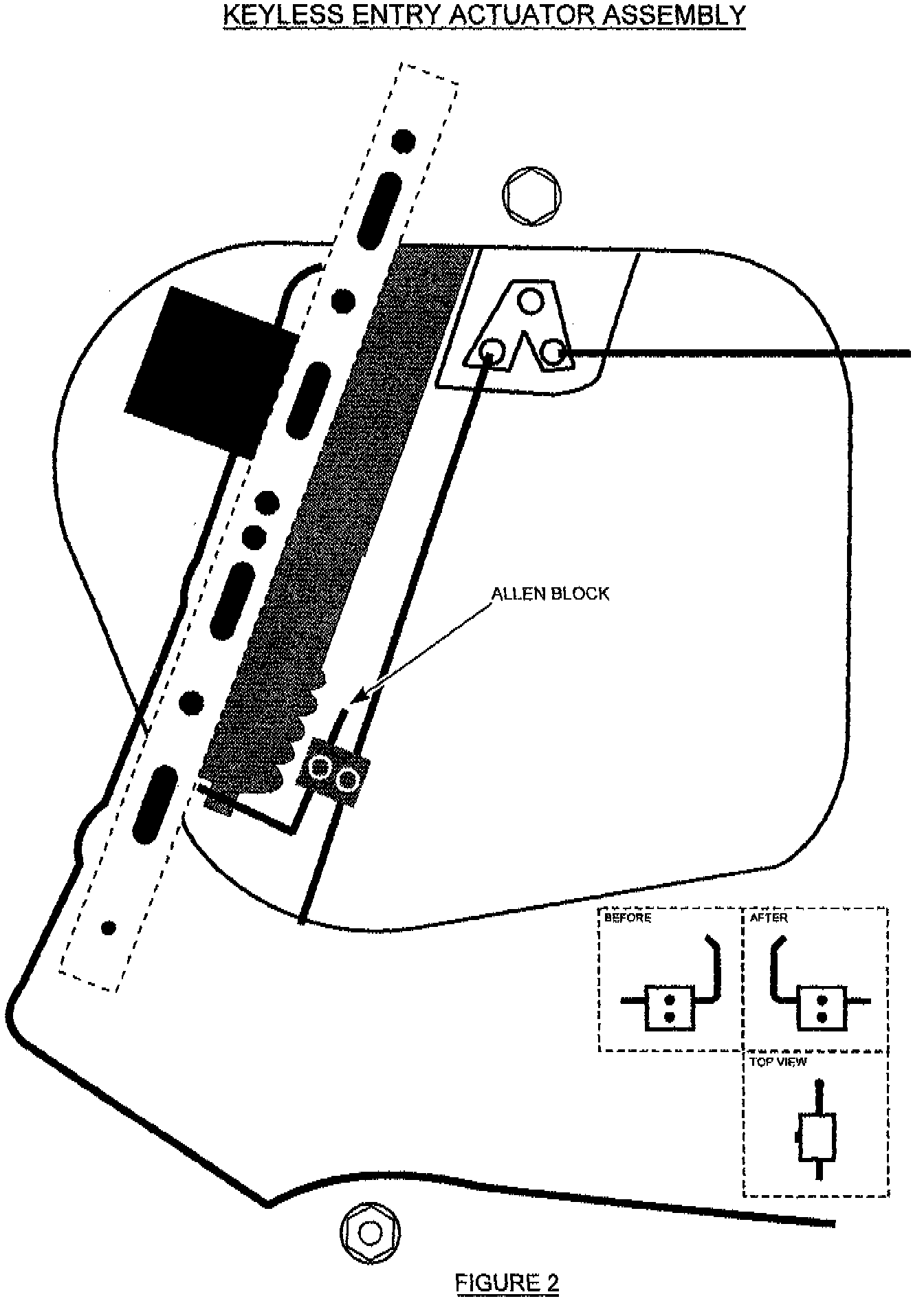 If you receive a customer complaint of the Keyless Entry System not operating properly investigate the following: Ensure that the transmitters are signaling the Keyless entry control unit by watching the parking lights flash when the transmitter buttons are pressed. If there is no parking light reaction and you cannot hear the actuator cycling inside the door panel, check the transmitter battery voltage. (Duracell-type MN21, Gold Peak type GP-23a or equivalent). Also, inspect all fuses to the system, powers and grounds, vehicle battery connections and voltage level. If the parking lights react to each transmitter button signal and the sound of the actuator cycling in the drivers door is heard, a disconnected or loose Allen Block may be the source of the inoperative Keyless Entry situation. Locate the Actuator Allen Block by removing the door panel and peeling back the plastic curtain to expose the Keyless Entry Actuator. See Figure 2. If the linkage is disconnected and/or loose, order a new Allen Block part number H7110AS130 through normal parts channels. See Figure 1.