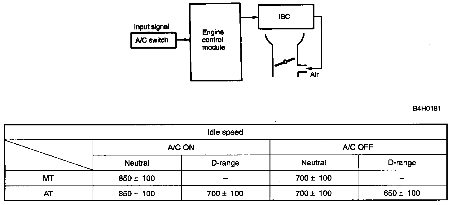 The Engine Control module activates the idle speed control solenoid valve in advance to control the amount of by-pass air flowing through the throttle body in relation to the signal emitted from the A/C switch, so that the proper idle speed specified for each engine load is achieved.